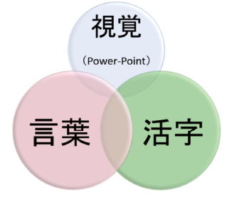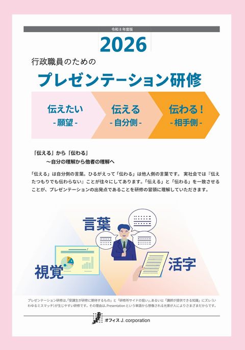 プレゼンテーションとは、「他者に対して説明する・伝達する・発表する・表現する」全般を指す単語であり、言葉による説明の他に活字による説明、近年になって登場したパワーボイントなどによるデジタルプレゼンテーションなどがあります。今回の研修は “言葉による説明力”の強化を軸にしながら、前述の二つの領域をも総合的にカバーするものです。